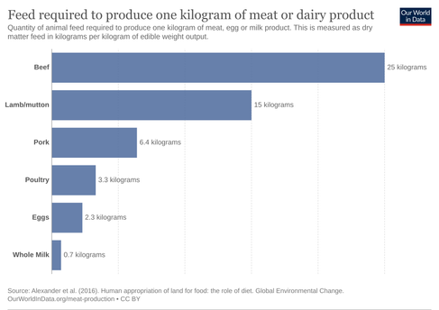 Husk graferne i toppen, som viste, hvor meget dyrene spiser i forhold til, hvad mennesker får ud af dem af kalorier i sidste ende. En ko spiser fx mellem 7 og 10 kg korn om dagen og kan drikke 100 liter vand om dagen. Det er et enormt forbrug af resurser.
