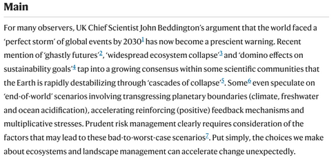 Verdens økosystemer er allerede under hastig forandring. Regnskove fældes og bliver forvandlet til savanner. Der er ørkendannelser, hvor der før var frodigt. Isen smelter med hastig fart. Kombinationen af alle disse økologiske belastninger arbejder sammen for at gøre sammenbrud af økosystemerne langt mere sandsynligt og meget tættere på, end tidligere forudsagt.